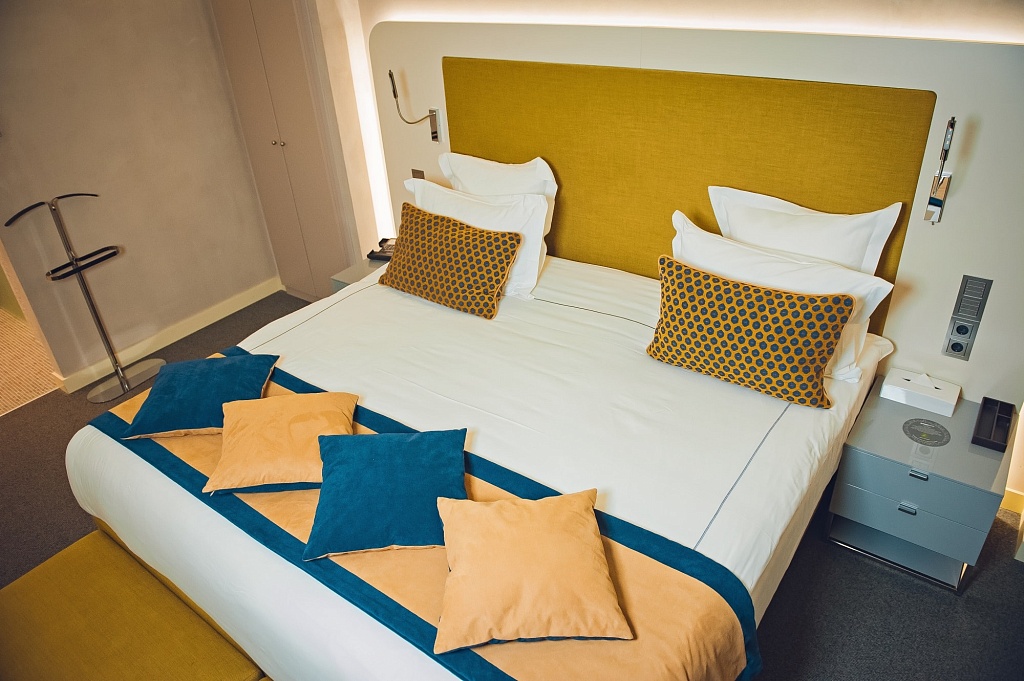 НОМЕРНОЙ ФОНД. Отель насчитывает 105 дизайн-номеров категорий Классик, Делюкс, Люкс и представленный в единственном экземпляре Гранд-Люкс. Все гостевые комнаты обставлены современной светлой мебелью. Плавные геометрические формы, обтекаемые линии, акценты на детали и необычные арки погружают в атмосферу спокойствия, релакса, и в то же время будят воображение, вдохновляют на творчество. Вид из окна на столицу – восхищает. Главной «фишкой» каждого номера являются сюжеты, представленные на картинах, которые превосходно дополняют оригинальный дизайн отеля. При размещении я всегда обращаю внимание на детали, потому что хочу оградить себя от лишних стрессов в виде нехватки косметических принадлежностей, поисков питьевой воды, утюга и прочих мелочей. Здесь все номера достаточно просторны, оснащены кондиционером, HD-телевизорами и спутниковым ТВ. В номерах есть холодильник и сейф, а в ванной комнате вы найдете все необходимые принадлежности. Неоднократно мне доводилось сталкиваться с проблемой доступа Wi-Fi в ряде отелей: кратковременный доступ, постоянные сбои в сети, а в некоторых случаях даже платный доступ к интернету. Поскольку мой рабочий график предполагает быть на связи 24/7, мне крайне важно, чтобы в отеле был быстрый и удобный доступ к интернету. Здесь доступ к высокоскоростному Wi-Fi предоставляется повсеместно, проблем со сбоями у меня не было.