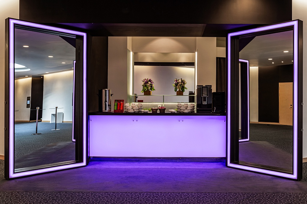 • возможность трансформирования и зонирования конференц-пространства позволяет реализовывать мероприятия любого формата: от камерных деловых встреч до многосоставных конференций с разделением зон/изменением рассадки в течение одного бизнес-дня;