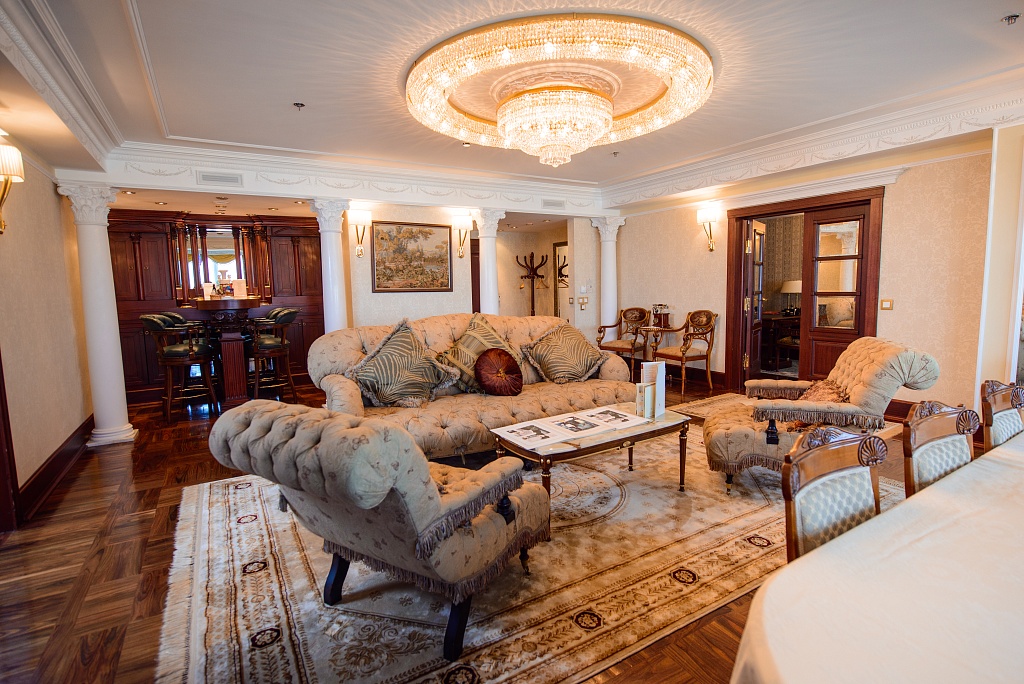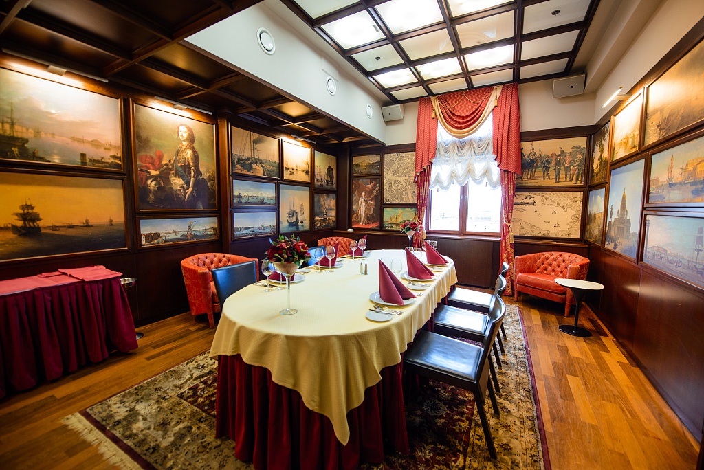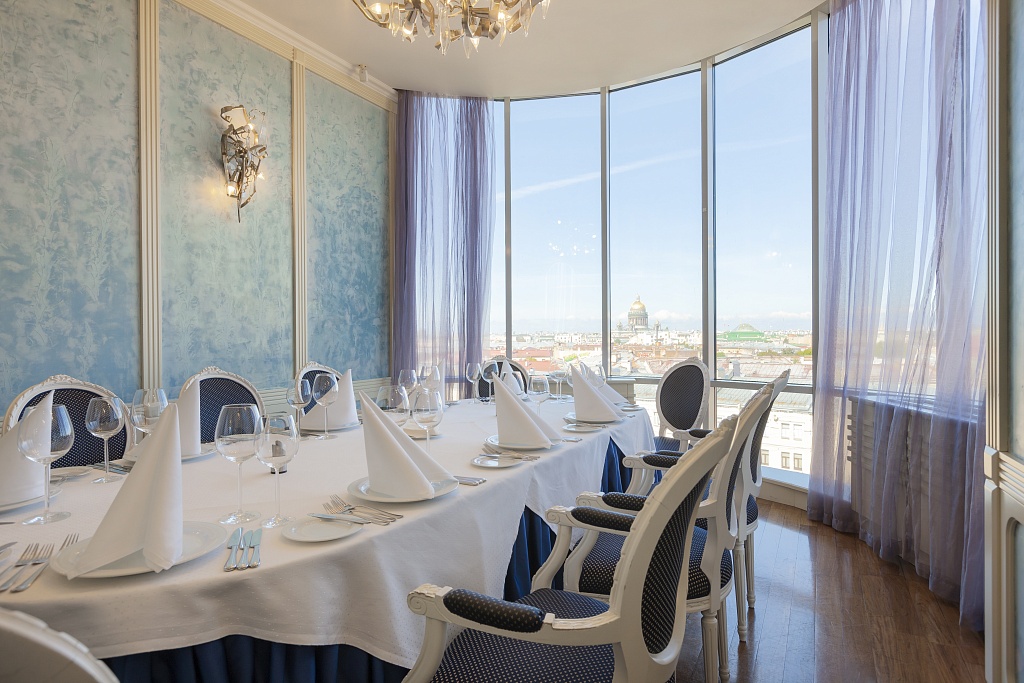 - залы для камерных мероприятий: элегантная «Сигарная комната» (30 кв.м) – 14 гостей за банкетным столом, изящная панорамная «Голубая гостиная» (20 кв.м) – на 12 гостей и дизайнерский бар «Консерватор» (89 кв.м), где банкетом можно разместить до 42 человек.