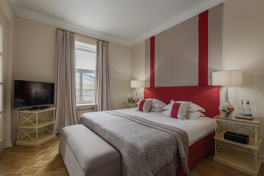 «Англетер» – один из первых отелей, построенных в Петербурге (первая гостиница на этом месте появилась 180 лет назад). Современный классический интерьер 192 номеров разработан директором по дизайну Rocco Forte Hotels – Ольгой Полицци. Натуральные материалы, светлые тона, яркие акценты и великолепный вид из окон создают уютную и по-настоящему домашнюю атмосферу. В большей части номеров есть широкие подоконники, покрытые мягкими матрасиками – это идеальное место для того, чтобы наслаждаться видами на Исаакиевский собор с чашкой чая в руках.