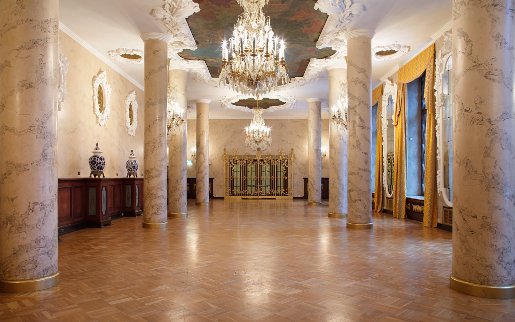 Самый вместительный Бальный зал площадью 300 кв. метров и отдельным входом с улицы примет конференцию (до 200 человек), банкет (до 120 человек) и масштабный прием статусных гостей (до 350 человек).