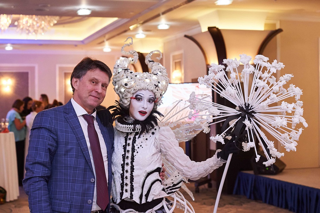Всё то время, что гости собирались в зале, их развлекали забавные персонажи Театра Иллюзии, снимали фотографы на фоне кулис в фирменном сливовом цвете бренда Crowne Plaza, а также на мероприятии беспрерывно работал скетчист, который отображал образы гостей на бумаге в стилистике театра и кабаре.