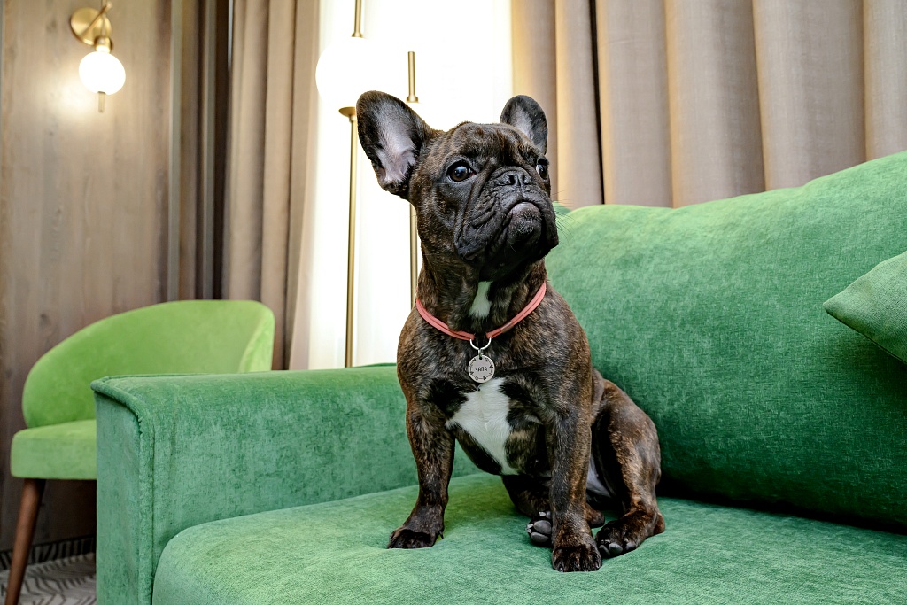 Нестандартным моментом в перечне задач стала съемка ... французского бульдога по имени Чапа. Так была освещена тема проживания с животными в номерах. Чапа оказалась прекрасной моделью!
