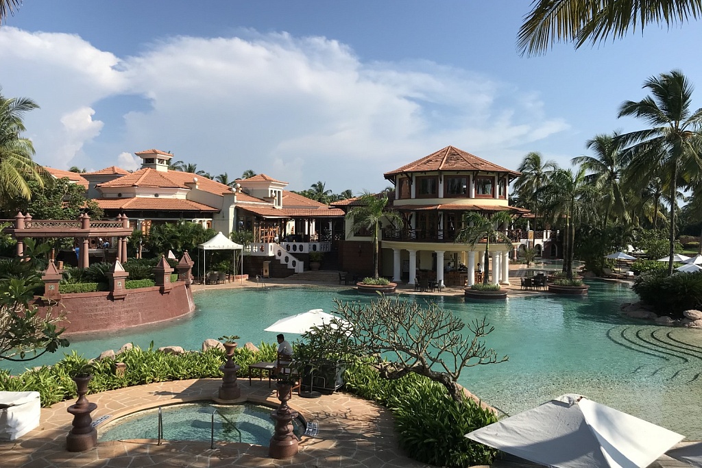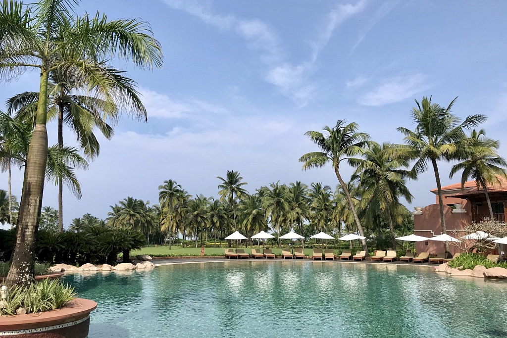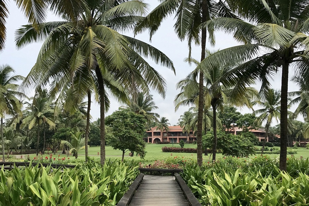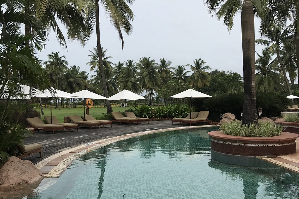 Помимо красивого, широкого, песчаного, пустынного, а главное – абсолютно чистого пляжа, контролируемого охранником и спасателем, да еще и в пяти минутах ходьбы от вашего номера, в ITC Grand Goa есть огромная, ухоженная, живописная территория и серия фантастических каскадных бассейнов, где заботливые бич-бои, не успели вы сделать шаг, накрывают матрас на шезлонге полотенцем, для вашего удобства сворачивая второе под голову. Разве нужно большее для счастья?
