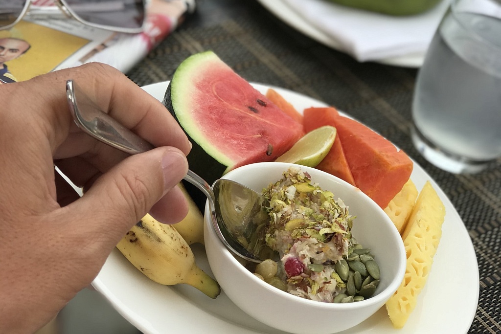 Мои индийские завтраки почти такие, как европейские, только лучше: теплая вода с лаймом и молодой кокос для начала, затем много спелых, сочных фруктов, черный кофе или имбирный чай с лемонграссом, яйца Бенедикт на подушке из нежного авокадо с ломтиком лосося, бирхер-мюсли или нежнейший йогурт с тягучим мёдом и вымоченными орехами… В ITC Grand Goa, как это положено для пользы дела и лучшей усвояемости всех элементов, орехи на ночь замачивают! А в завершение – много-много пляжа и моря!