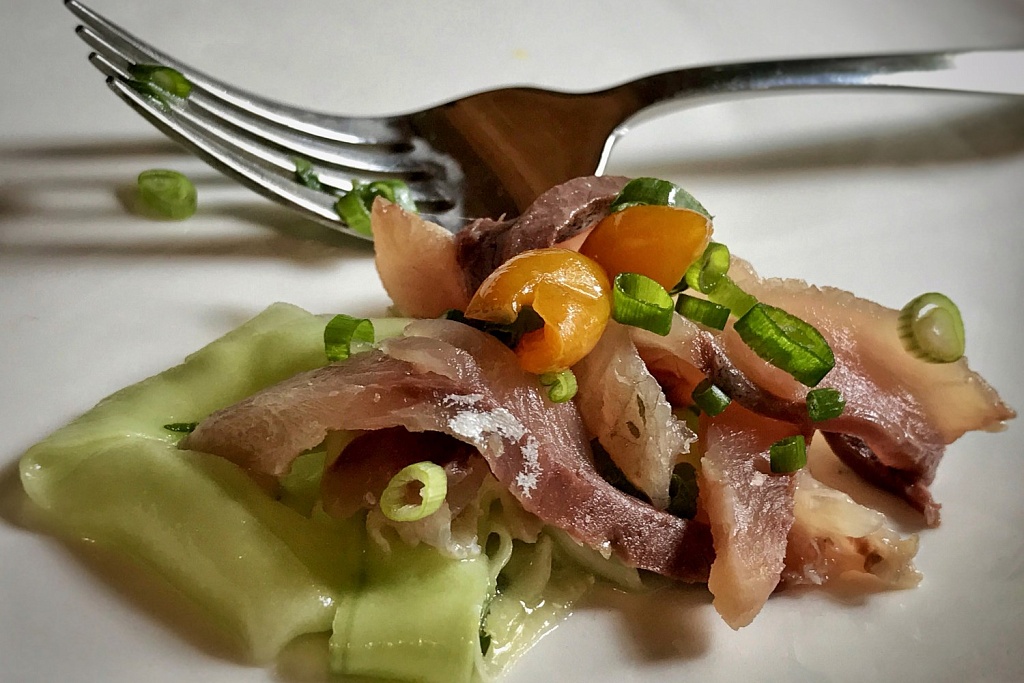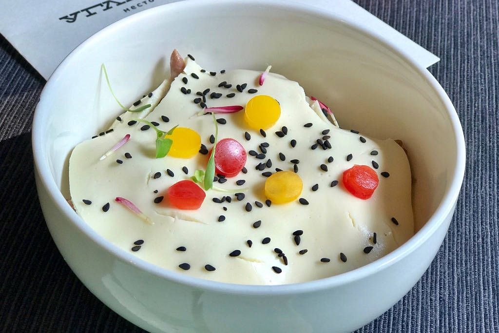 Серый хлеб, выпеченный прямо здесь, на отрубях с кубанскими семечками, домашняя сметана с черной подкопченной солью и сезонный соус из зелени – комплимент от шефа. В Москве в наше-то время не распространены подобные щедроты, а в Краснодаре в то время – пожалуйста! – небольшое угощение от Андрея Матюхи, за которым вы можете скоротать время в ожидании заказанного.