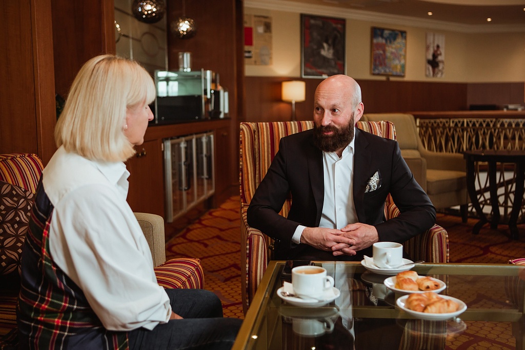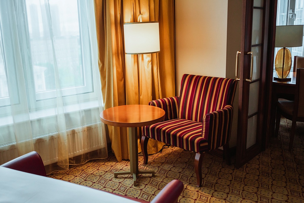 Наш разговор начался в 10 утра в Представительской гостиной. Этот стильный двухуровневый лаунж с просторными террасами на 16-ом этаже отеля является предметом профессиональной мечты заместителя главного редактора MICE&more Марины Карасёвой: уж очень хочется организовать здесь красивое мероприятие с видом на столицу, немного на ипподром и на башни Москва-Сити.