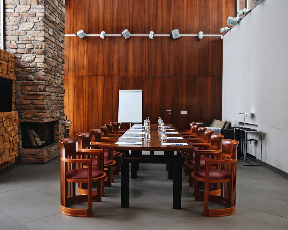 Обращаю ваше внимание на то, что в этих номерах очень комфортно проводить переговоры в удобной гостиной с панорамным видом на красивую природу. Максимальная рассадка — до 20 человек «театром» в переговорной, в ресторане — до 40 человек.