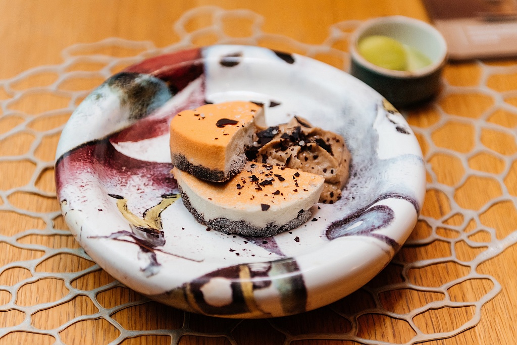 И, конечно, десерт «Я и деревня» стал невероятным открытием вечера. Крем из бородинского хлеба (который до этого момента всегда ассоциировался только с основным блюдом) с шоколадным бисквитом и мороженым из базилика — это сочетание, которое звучит так же загадочно, как картина, которая послужила вдохновением. Необычный вкус и отсутствие приторной сладости стали для меня "вишенкой" на этом прекрасном вечере.