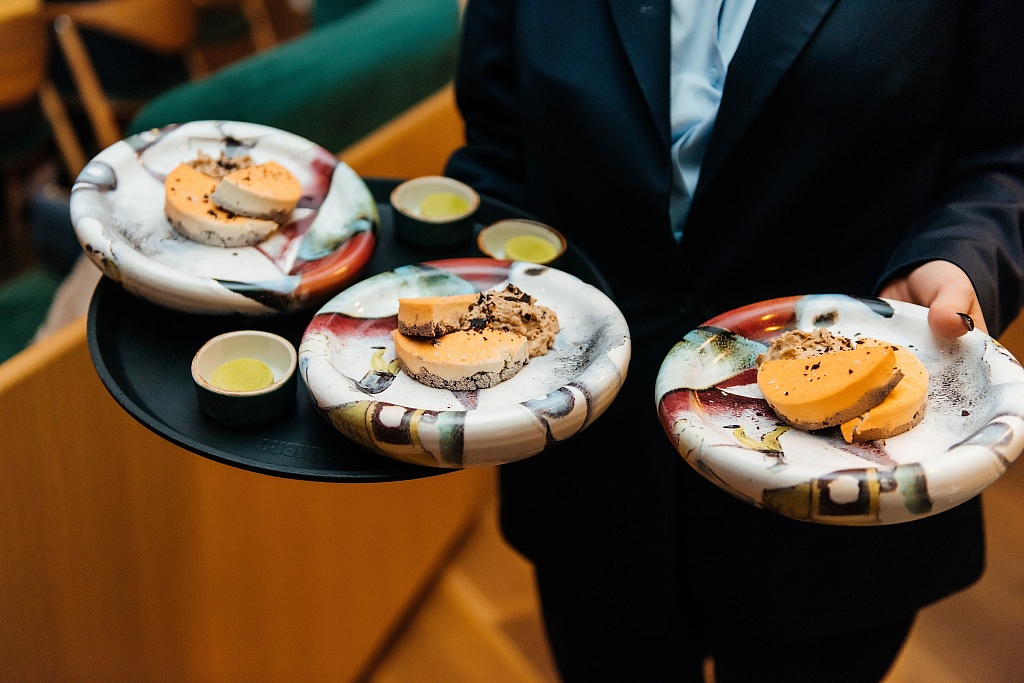 Готовясь к нашему вечеру, шеф-повар включил творчество, погрузился в тематику, изучил творчество Шагала, продумал каждое блюдо. Я всегда очень дотошно и тщательно обращаю внимание на детали. Это моя фишка. И вот здесь каждая деталь появляется не просто так, не сама по себе. Это не тот вариант, когда сначала сделали, а потом притянули к идее. Нет! Сначала была рождена именно концепция. Далее она прирастала картинами и образами, превращалась в меню, проявлялась в подборе посуды. Тарелки здесь просто невероятные. Понятно, что таких совершенно точно больше нет нигде. И теперь мне очень хочется, чтобы они появились у меня дома.