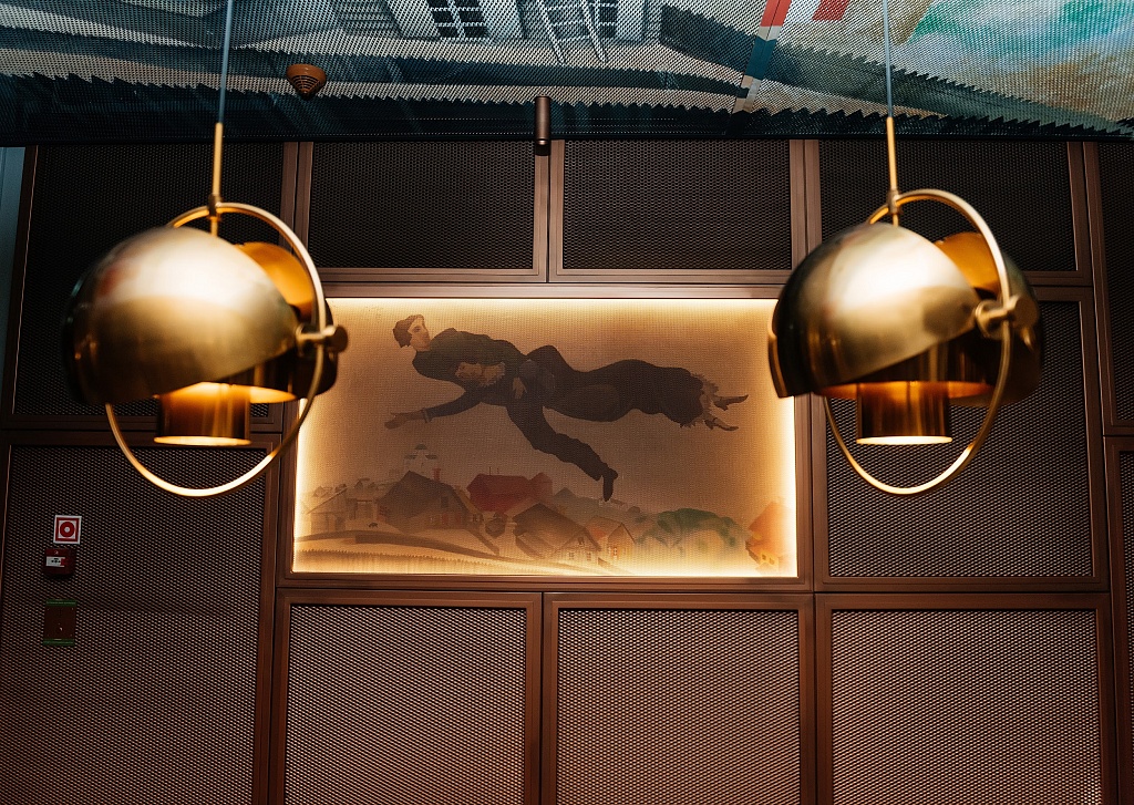 Удивительный ресторан Shagal, где каждое блюдо и напиток как искусство. Хочу обратить внимание, что дизайн ресторана создан под вдохновением картинами Марка Шагала. На самом видном месте мы можем наблюдать реплику картины «Над городом». После такого высокохудожественного посещения хочется быстрее бежать в Третьяковку».