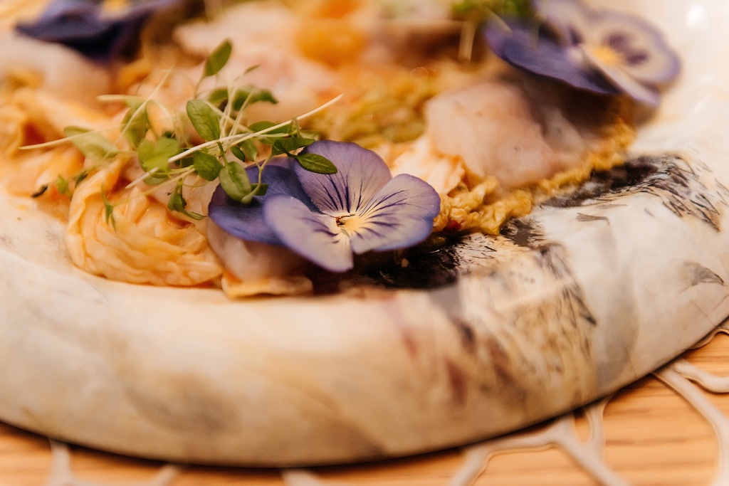 Первое блюдо - закуска «Падение Икара» — это нежное севиче из дорадо, пикантная капуста кимчи и утонченная сладость соуса из манго и маракуйи, а в качестве специального сюрприза - пузырьки детской радости, которые лопались на языке. Завершающим штрихом стали яркие цветы на тарелке, которые добавили этому блюду театральности и красочности.