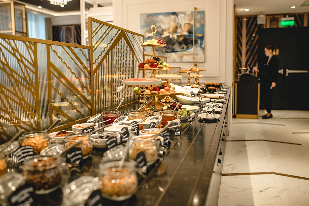 Наш завтрак проходил в ресторане Galerie, его вместимость 105 посадочных мест. Но приятно посидеть в отеле можно и на первом этаже в Cafe Imperial. Когда будете рядом с отелем, вспомните, что это кафе – идеальное гастрономическое пространство, отлично подходящее для делового общения или встречи друзей.