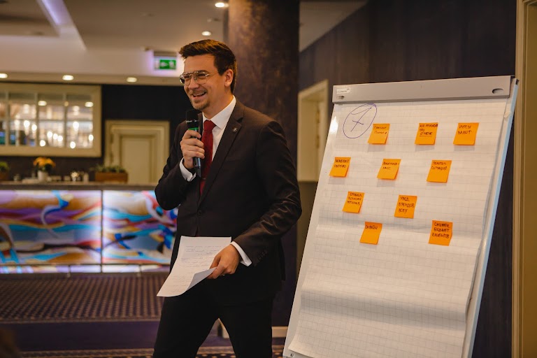 Далее участников пригласили в зал Dorchester на деловую часть в формате стратегической сессии от компании Top Moderator. Brain storm в группах прошел по схеме: «визитные карточки» участников – формирование списка «болевых вопросов» – определение ТОП-3 самых актуальных – фокусировка группы на решении одной из проблем – предложение конкретных действий.