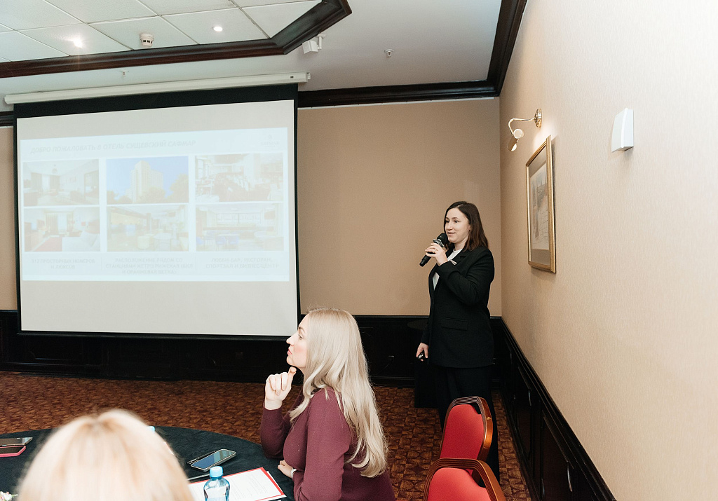 Открыл митап Генеральный менеджер отеля Safmar Тверская Толдиев Багаутдин. Далее взяла слово директор MICE-департамента сети Safmar Hotels Мария Человечкова и представила участникам возможности семи московских отелей бренда, объединенных под единым стандартом сервиса и работы с деловыми событиями.