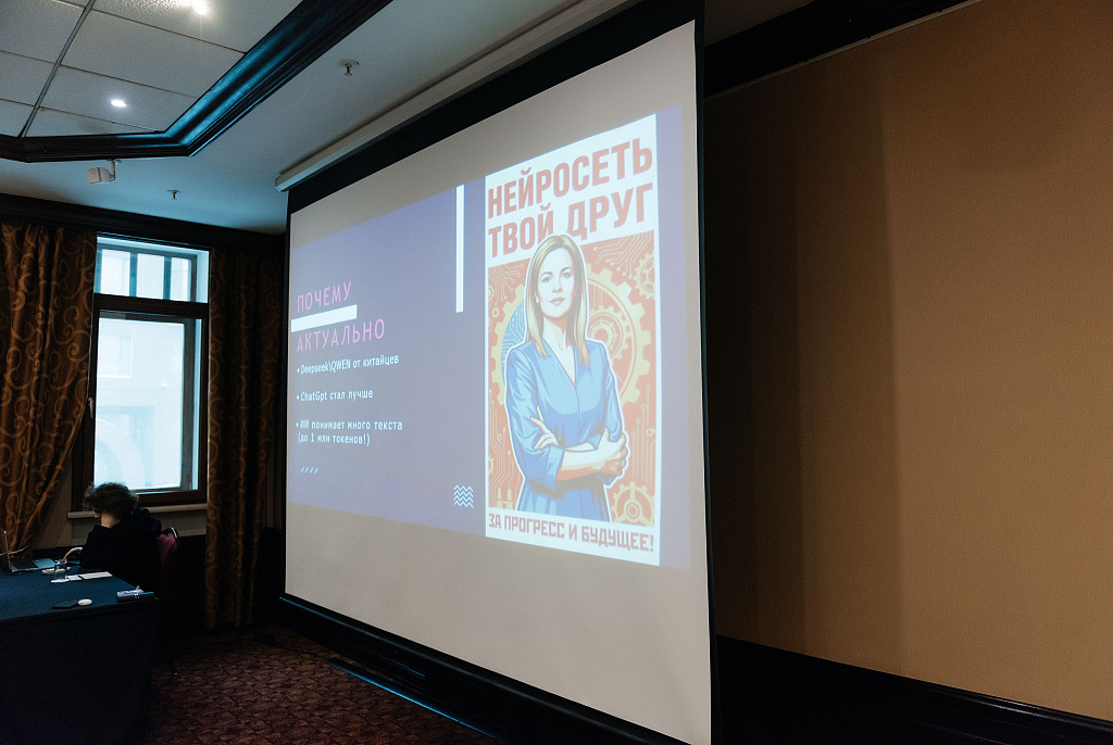 На конкретных примерах Иван показал, как нейросети сегодня берут на себя задачи дизайна, копирайтинга, видеомонтажа, музыкального оформления и подготовки презентаций. Ключевой акцент Иван сделал не на самих сервисах, а на умении с ними работать. Отдельное внимание было уделено промт-инжинирингу: как формулировать запросы, обогащать контекст, задавать уточняющие вопросы и получать результат, сопоставимый с работой команды специалистов.