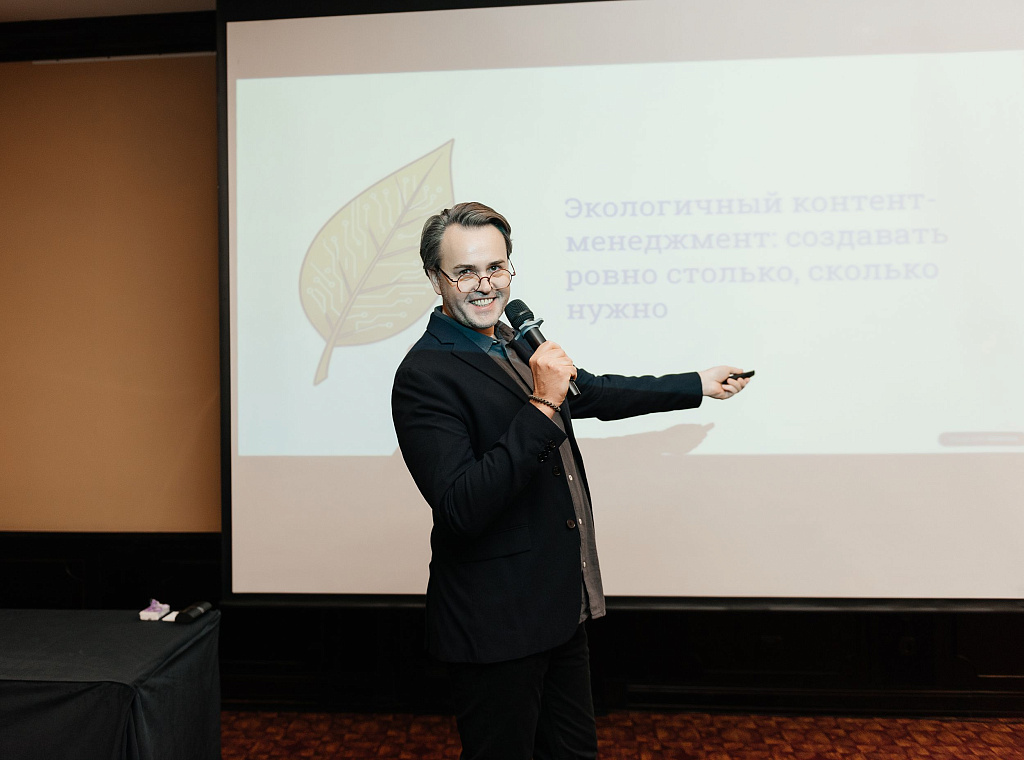 Тема Владимира Пожидаева стала логичным противовесом цифровому ускорению. Его выступление было посвящено экологичному контент-менеджменту – умению создавать ровно столько контента, сколько действительно необходимо бизнесу и аудитории.