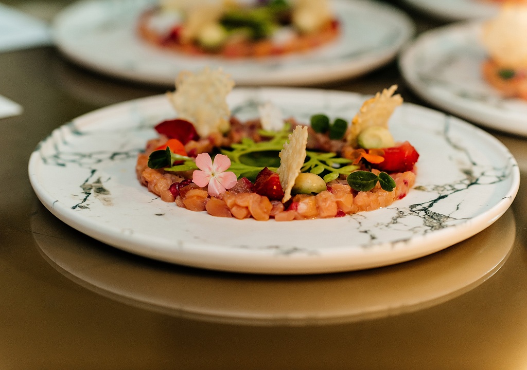 Тартар из лосося с клубникой и чипсами из пармезана / UNA Gruner Veltliner (Австрия, белое сухое)