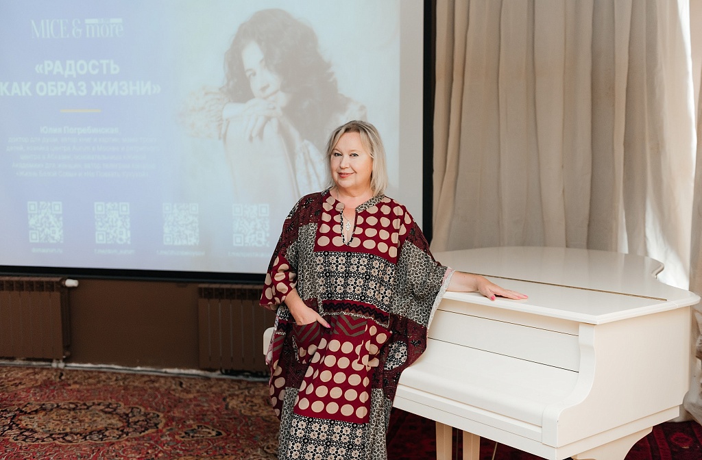 Юлия Погребинская называет себя не психологом, а «доктором для души». Она автор книг и картин, мама троих детей, хозяйка центра Aurum в Москве и ретритного центра в Абхазии (в котором группа MICE&more побывала в июле), а также основательница «Живой Академии» для женщин.
