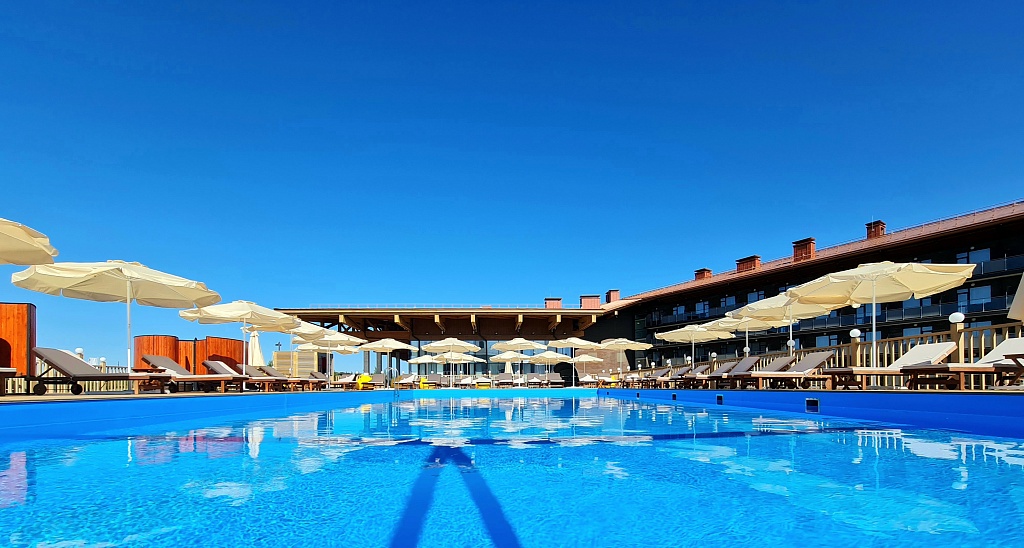 Особенность нового комплекса - это 2 разных бассейна. В большом, протяженностью 18 метров и глубиной 1.35 метра, вода нагревается от +26 до +28 градусов, обеспечивая комфорт взрослых отдыхающих в любую погоду.
