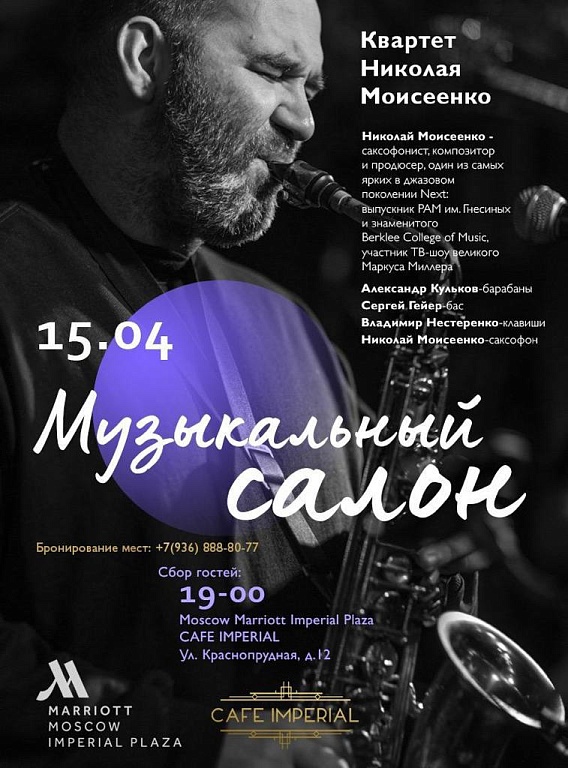 Для истинных ценителей живой музыки, высокой гастрономии и стильной камерной обстановки в Cafe Imperial открывается «Музыкальный салон», где можно насладиться ярким звучанием джаза и погрузиться в непревзойденную атмосферу начала ХХ века.