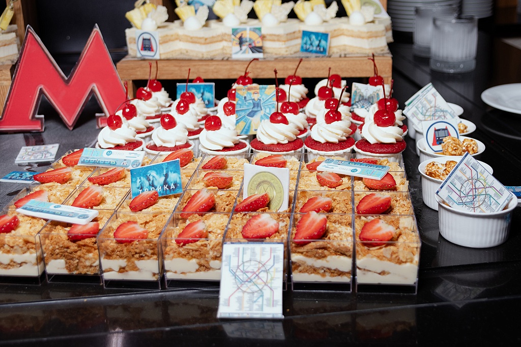 Начало вечера украсил Welcome-фуршет с тематическими закусками и напитками, погружающими в стиль метрополитена прямо с порога, точнее с регистрационной стойки, оформленной в стиле московского метро. Для гостей были организованы развлекательные зоны: фотобудки с мгновенной печатью снимков, видеовикторина и конкурс «Угадай станцию метро по фото», которые добавили интерактива и радостных эмоций.
