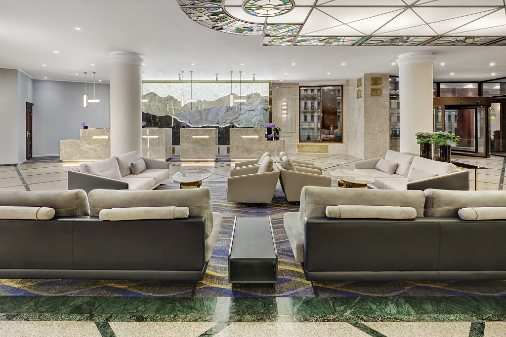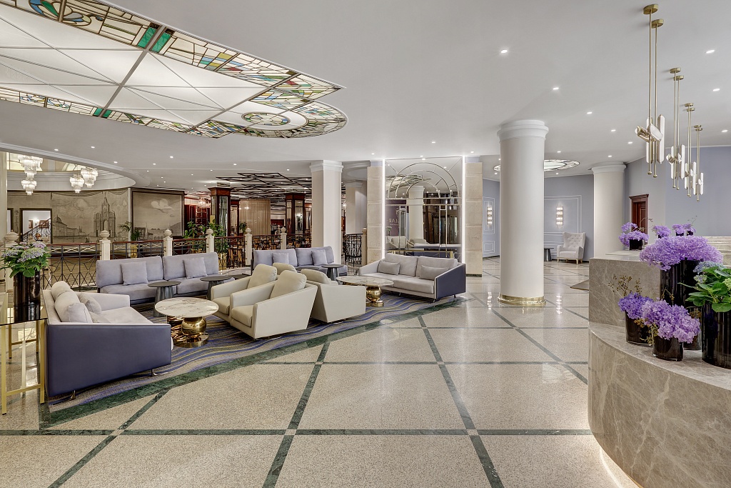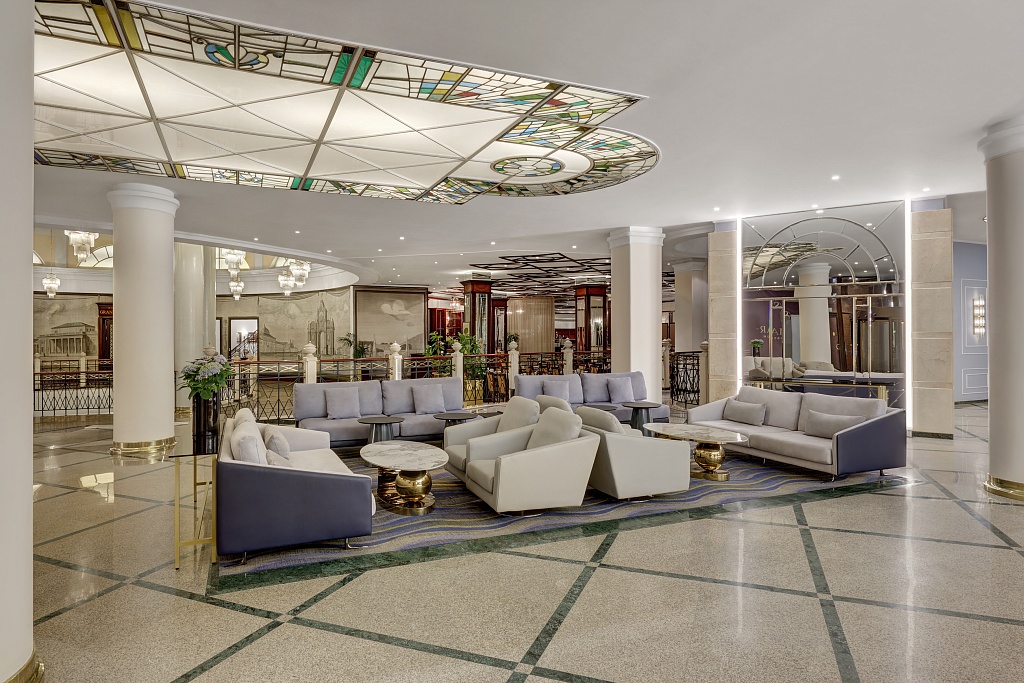 Вращающиеся входные двери отеля приглашают гостей войти в обновленное пространство. Лобби с огромным стеклянным куполом в центре и гобеленами художника Андрея Васнецова на стенах, знакомое многим с 1997 года, значительно преобразилось. Оно приятно удивляет обилием света и современным решением зонирования, соответствующим ожиданиям гостей XXI века. С первых минут новое пространство завораживает, усиливая величие хорошо знакомых архитектурных деталей здания, имеющего отсылки к нескольким эпохам - XVIII, ХIХ, ХХ и ХХI веков.
