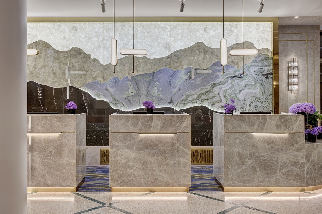 Перед зоной панно тоже произошли приятные изменения: вместо единого монументального, выполненного из темных материалов стола для регистрации гостей, появились 4 изящные стойки из светлого мрамора, подсвеченные сверху лёгкими светильниками. Благодаря этому решению лобби отеля заиграло новыми красками, став более ярким и выразительным, при этом границы между гостем и отелем были стерты, сделав их ближе к друг другу.