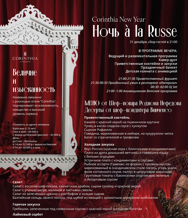 Взрослые (с 15 лет): Стол в зале – 60 000 р С видом на Невский проспект – 65 000 р Дети: до 5 лет – бесплатно 6-14 лет 32 500 р с видом на Невский 6-14 лет 30 000 р в зале