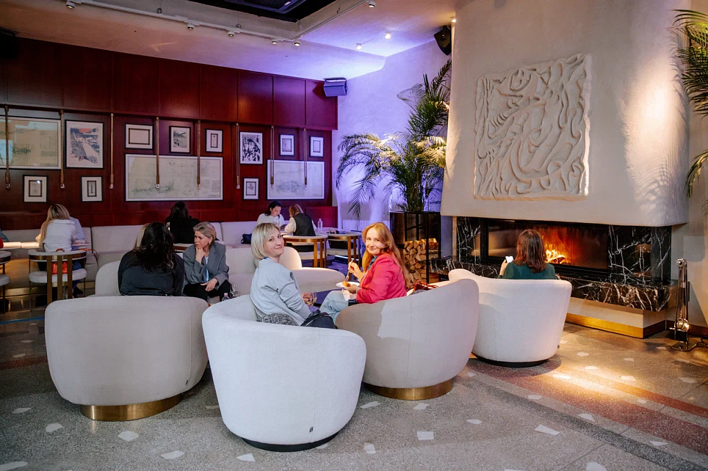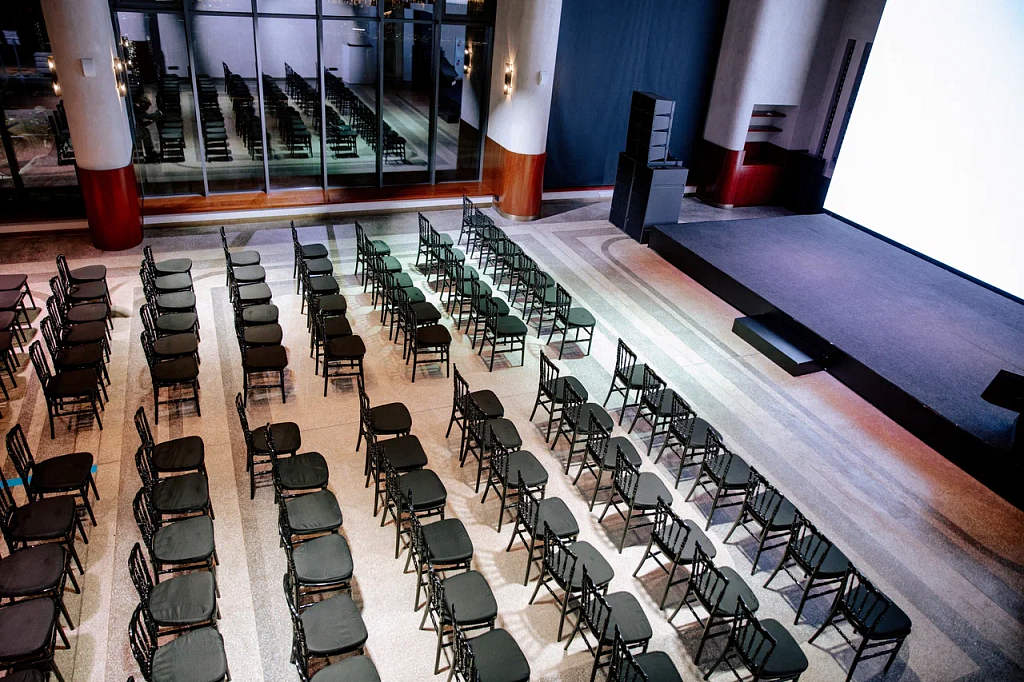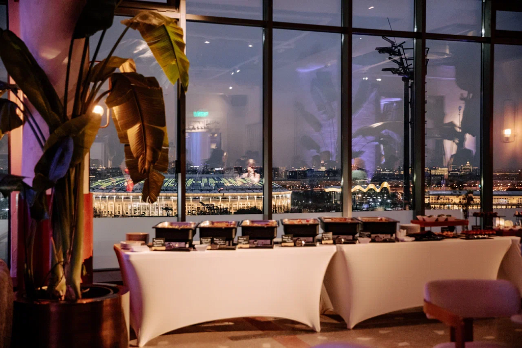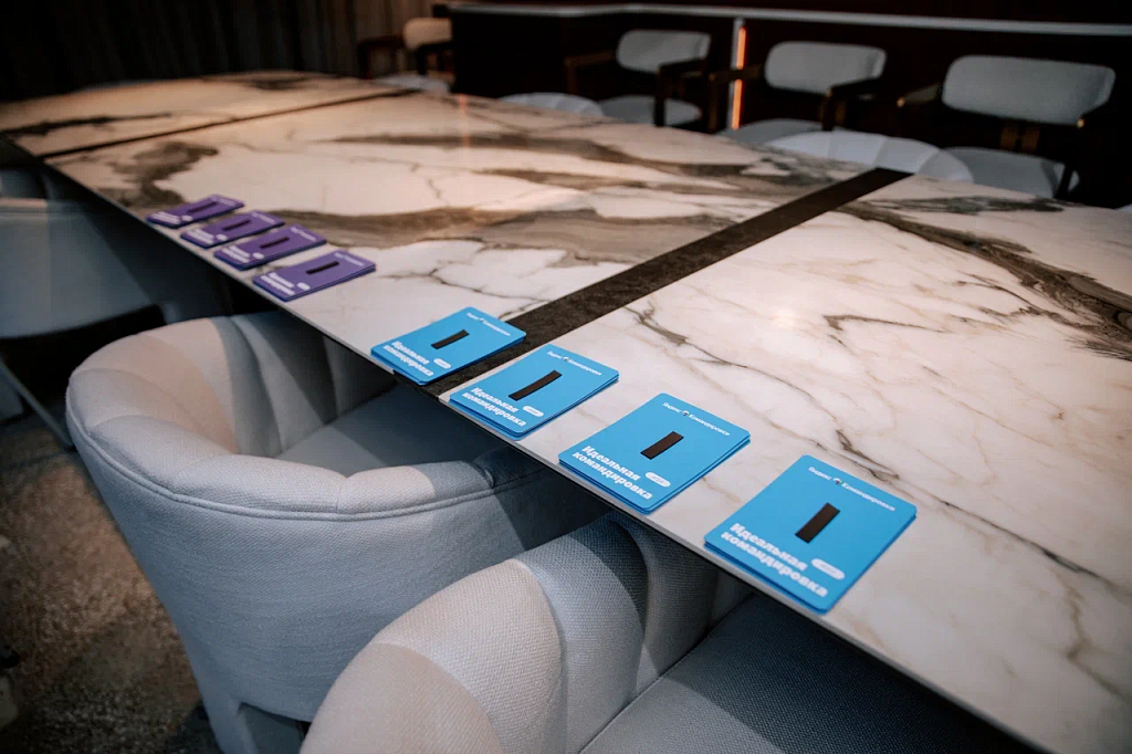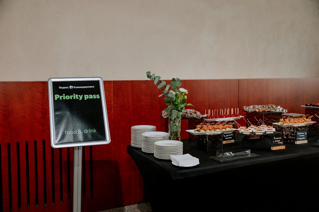 Мероприятие отличалось изобретательностью. Всех гостей встречали стюардессы в голубом и выдавали бэйджи-билеты «Priority Pass». В просторном зале с роскошным панорамным видом на Лужники и Москва-реку нас ждал «предполетный» кофе-брейк и стилизованная под зал аэропорта фотозона. Экран был оформлен как табло вылетов. Ровно в назначенный час мы «пристегнули ремни и полетели».