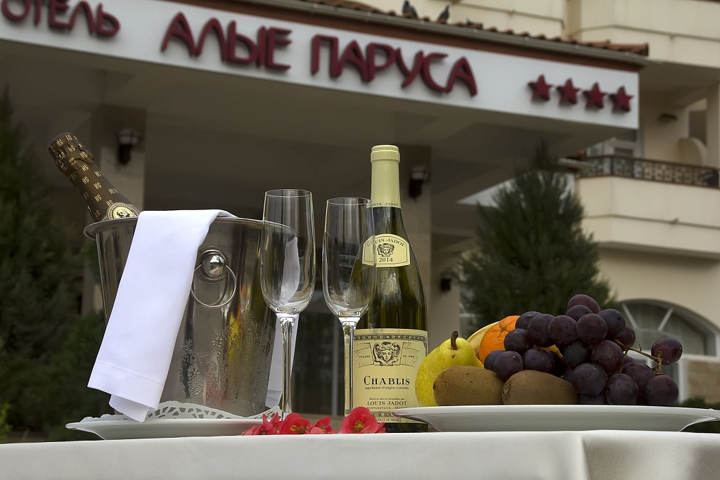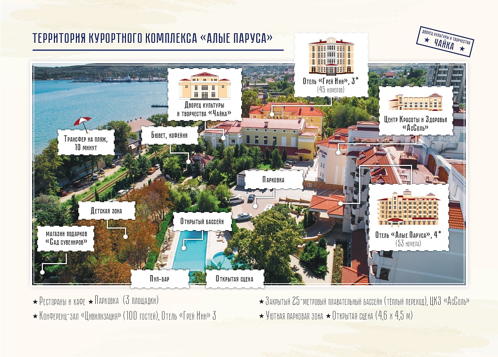 В комплексе «Алые Паруса» с комфортом можно разместить от 200 до 270 гостей. Для этого на территории есть два корпуса: отель «Алые Паруса» 4* – 53 номера разных категорий и отель «Грей Инн» 3* – 45 номеров. Отельный комплекс расположен в историческом центре города, прямо на набережной, так что из номеров открывается вид на живописную бухту. У «Алых Парусов» своя парковая зона, рядом – музеи, городские памятники культуры и кафе. У отеля есть собственный большой полностью благоустроенный песчаный пляж, куда в период морского сезона каждый час отправляется бесплатный трансфер. Кроме того, разнообразие точек досуга и питания комплекса позволяет максимально интегрировать их в деловую и опциональную программу: ресторан «Эрмитаж», кафе «Культурное», бар «Алкотека», открытый и закрытый бассейны, Центр красоты и здоровья «АсСоль», Дворец культуры и творчества «Чайка», интерактивный Музей рыбы и рыболовства, концептуальный магазин крымских подарков «Сад cувениров»… Охраняемая парковка для частного транспорта представлена несколькими площадками.