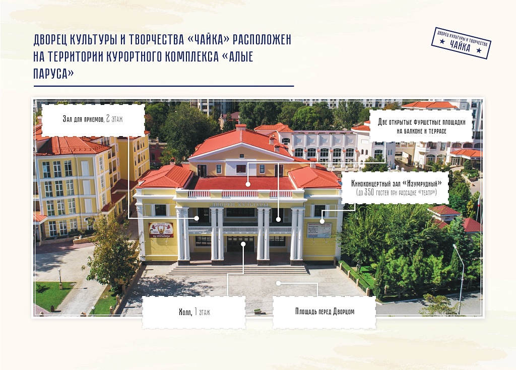 Дворец культуры и творчества «Чайка», кстати, совсем недавно открылся после реставрации. И вот он заслуживает отдельного внимания, потому что это идеальная возможность организовать нестандартные мероприятия. Не тот формат, где участники посмотрели презентации, послушали лекции и ушли на банкет, а полноценный выезд с приключениями. Тут возможны и квесты, и дегустации, и яркие фотосессии. Можно объединить работу с отдыхом на пляже, а можно – с посещением мест силы на Востоке Крыма, живописных местечек за городом или, не выезжая из отеля, отправиться на СПА-программу. Тут можно круто соединить бизнес с творчеством и креативностью так, чтобы получилась полноценная перезагрузка коллектива или ваших партнеров.