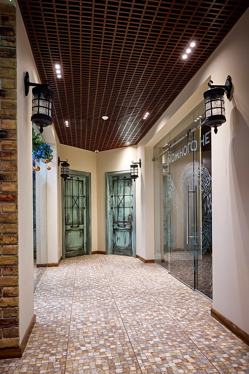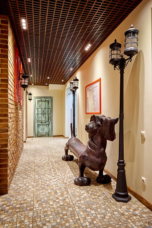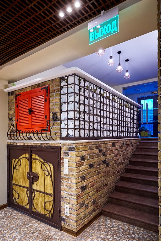 Наш офис находится на цокольном этаже, и дизайнеры иронично подчеркнули это грубой фактурой каменных стен и массивными фонарями.