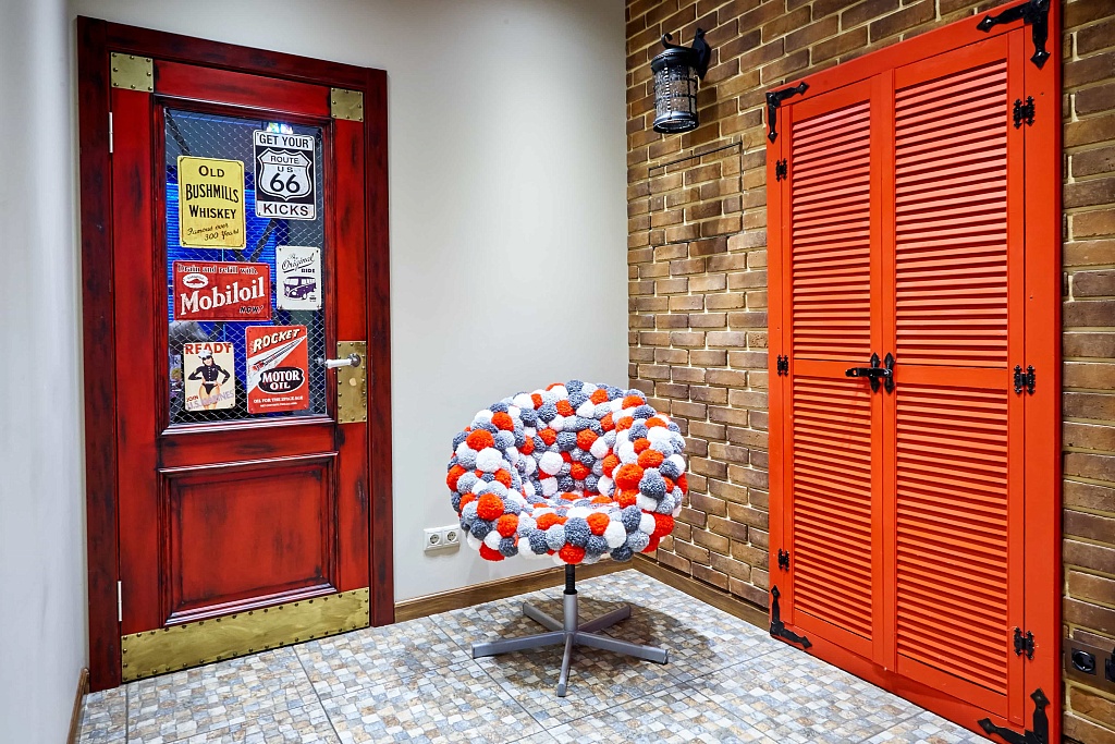 Неожиданные сочетания фактурных материалов: камня, дерева, стекла и железа — уравновешены природными цветами. В офисе есть неординарные вещи, например, стол из паллет в переговорной комнате, или «вязаное» кресло, при этом они очень функциональны и удобны.