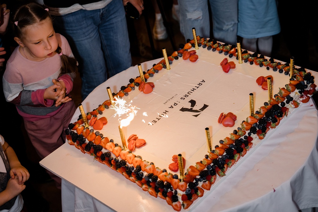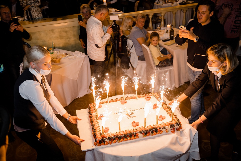 На десерт гостям преподнесли красивый и очень вкусный именинный торт, искусно украшенный свежими фруктами, традиционными французскими пирожными «макарон» и бенгальскими свечами. Завершающим аккордом стал эффектный, уличный фейерверк. Он украсил ночное небо россыпью переливающихся огней. Праздник прошёл отлично и оставил длительное французское послевкусие.
