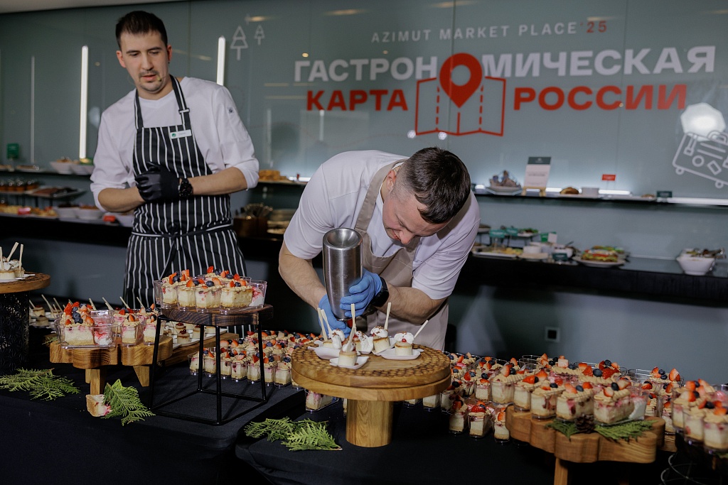 Дегустация блюд гастрономической карты России – добрая традиция AZIMUT Market Place. За день гости смогли совершить вкусное и необычное путешествие от Мурманска до Сочи, попробовать и открыть для себя новые горизонты. В этом году программу дополнило кулинарное шоу от представителей московского региона. Бренд-шеф сети AZIMUT Hotels Сергей Борцов и шеф-повар AZIMUT Парк Отель Переславль Дамир Хасанов презентовали гостям блюда по-настоящему русского завтрака – манник с клюквой, муссом из сгущенного молока и кремом из белого шоколада, а также творожную запеканку с яблочным пюре, моченой брусникой и сметанным кремом. Кроме того, гости могли также унести с собой яркое напоминание об AZIMUT Market Place 2025 – сувениры в русском стиле, созданные своими руками на мастер-классах.
