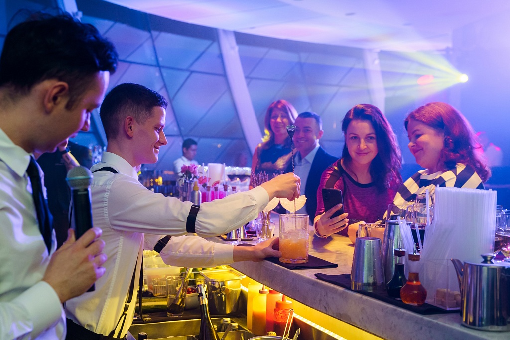 На 34-ом этаже гостям вечера вновь предлагали игристое, но в этот раз в великолепном окружении других напитков и роскошных авторских коктейлей, которыми славится местный бар, входящий в двадцатку самых лучших баров мира. Каждые полчаса бармены-виртуозы устраивали короткие шоу с демонстрацией уникальных рецептур, а между столиков курсировали официанты с живописными закусками.