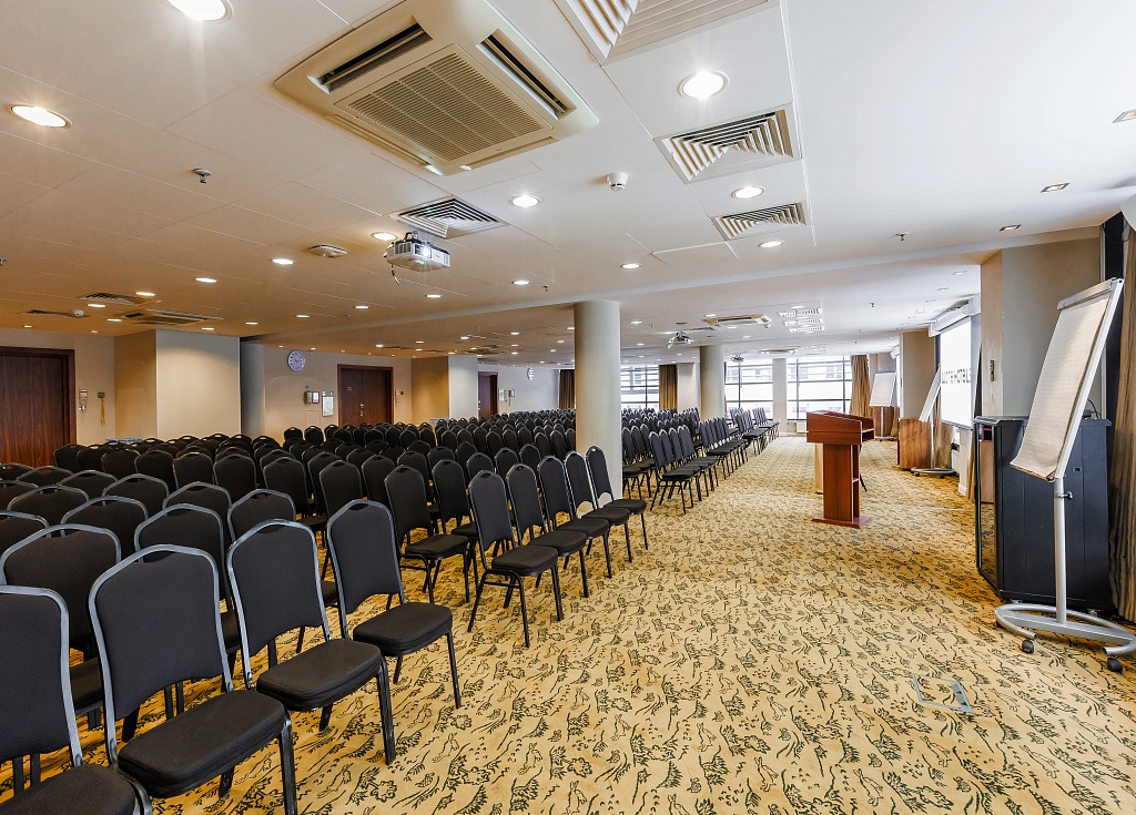 Самый большой зал – «Бальный» – вмещает до 400 гостей. Кроме того, данный зал – трансформер и делится на два крупных зала: «Фокстрот» и «Танго» (92 и 184 м2). Из строгого и сдержанного пространства для конференции он с легкостью преображается в пространство для торжеств. Есть три зала среднего калибра (56-60 м2): «Блюз», «Джаз» и «Соул», которые комфортно вмещают до 50 гостей. Две переговорные комнаты «Самба» и «Румба» отлично подойдут для встреч за круглым столом до 12 гостей.