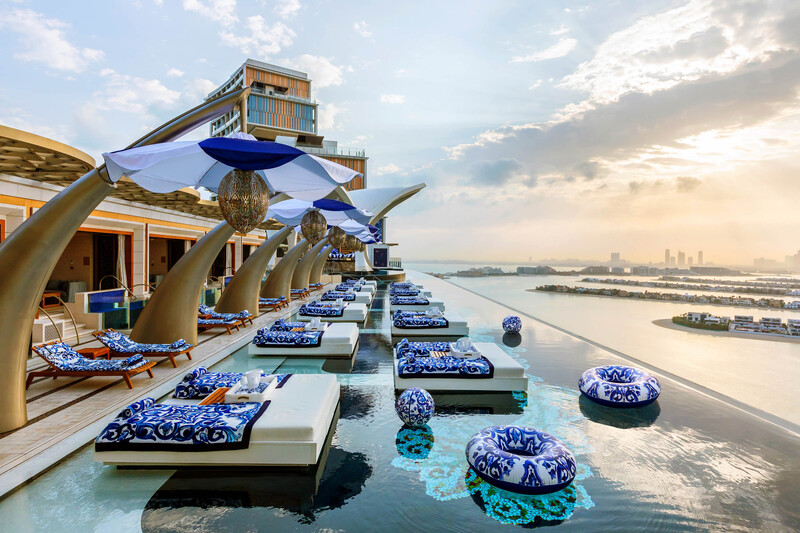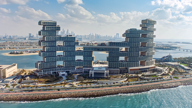 Удивляет футуристичный экстерьер отеля: в высотном разноуровневом здании с «пустотами» много легкости и динамики. Своей «воздушностью» он определенно бросает вызов знаменитым «культовым башням» Дубая. Внимание привлекают оригинальные водные элементы. Роскошное лобби встречает стальной инсталляцией «Droplets» (отражающей идею первой капли дождя в засушливой пустыне, 11.5 м) и огромными аквариумами с медузами, манящими в подводный мир, а каскад фонтанов вдоль центральной линии курорта вершится яркой кульминацией — игрой стихий воды и огня в шоу-фонтане Skyblaze, первом на Ближнем Востоке!