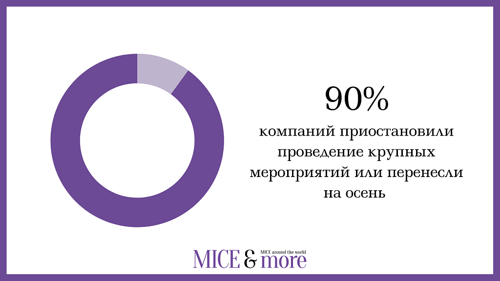 90% компаний сообщили, что крупные мероприятия на 100 и более участников пока приостановили и/или перенесли на более поздний срок (на осень). Также есть тенденция менять форматы проведения мероприятий: с банкетных на строго деловые с фуршетом.