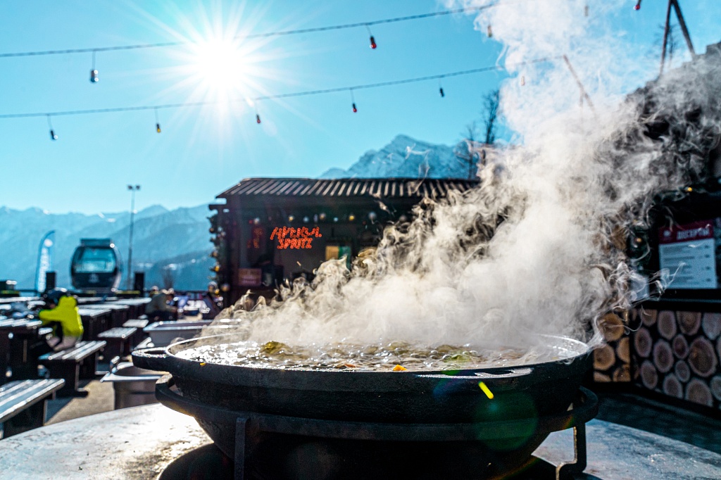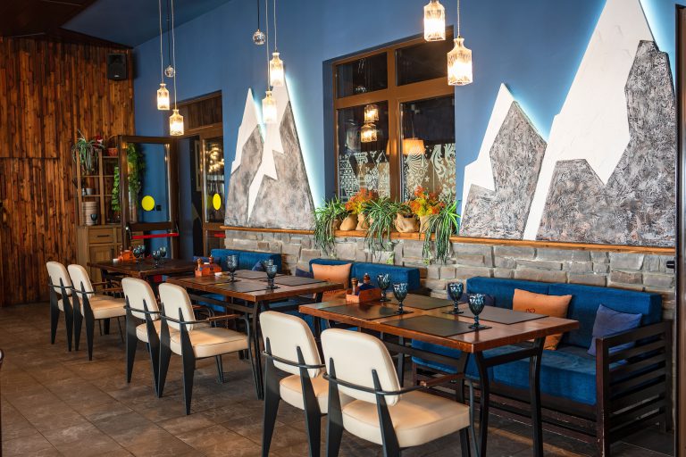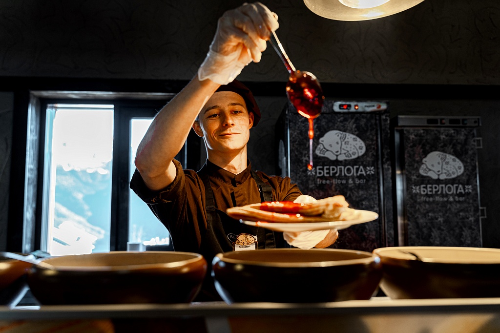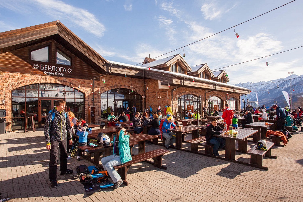 Дополним, что это самый популярный ресторан курорта, который расположен в Горной Олимпийской деревне при выходе с канатной дороги Олимпия. Основной зал оформлен в стиле шале: каменный пол, деревянные балки под потолком, стены в светлых тонах, лавки и столы, выполненные из натурального дерева. В нем может комфортно разместиться до 400 гостей.