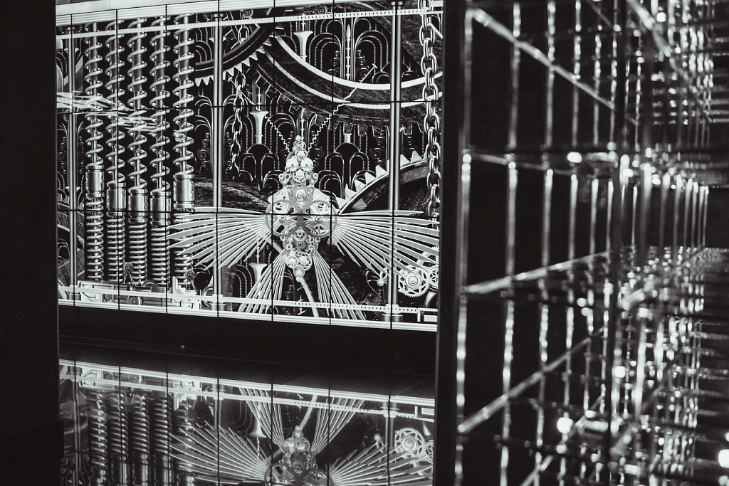 Удивление начинается буквально с первых шагов, когда перед посетителями открывается массивная дверь строгого на вид исторического здания по адресу улица Потемкинская, 4 (рядом с Таврическим садом) и вы сразу попадаете в удивительный мир «театрального зазеркалья», поскольку на первом этаже расположено центральное фойе, над которым работала испанский дизайнер Марта де Виллавонго. Сохранив торжественную атмосферу пространства начала XX века, она разместила здесь самую протяженную видеостену в Европе, состоящую из 99 дисплеев. По качеству транслируемого графического контента видеоинсталляцию можно сравнить с четырьмя IMAX. Проходя сквозь столь удивляющее пространство, зрители попадают на основную сцену.