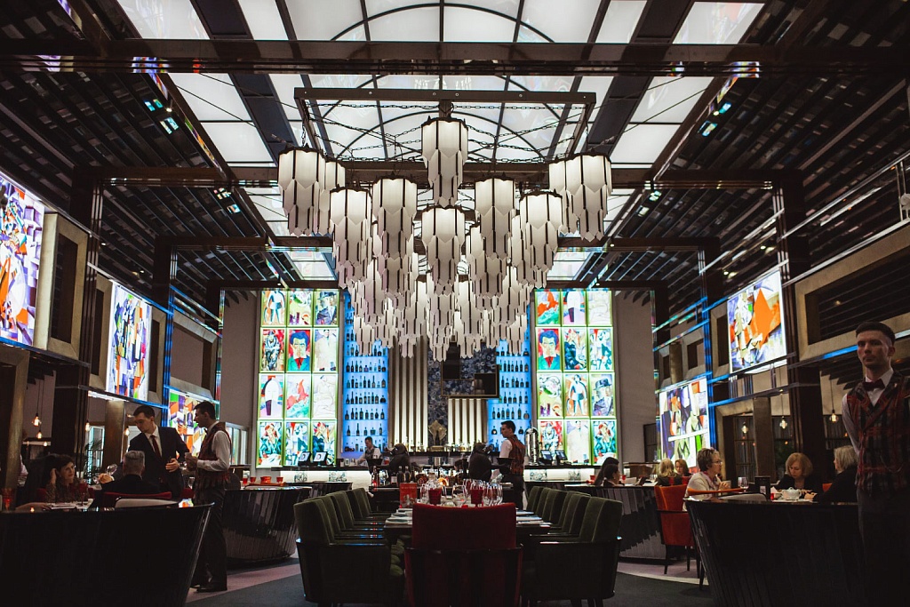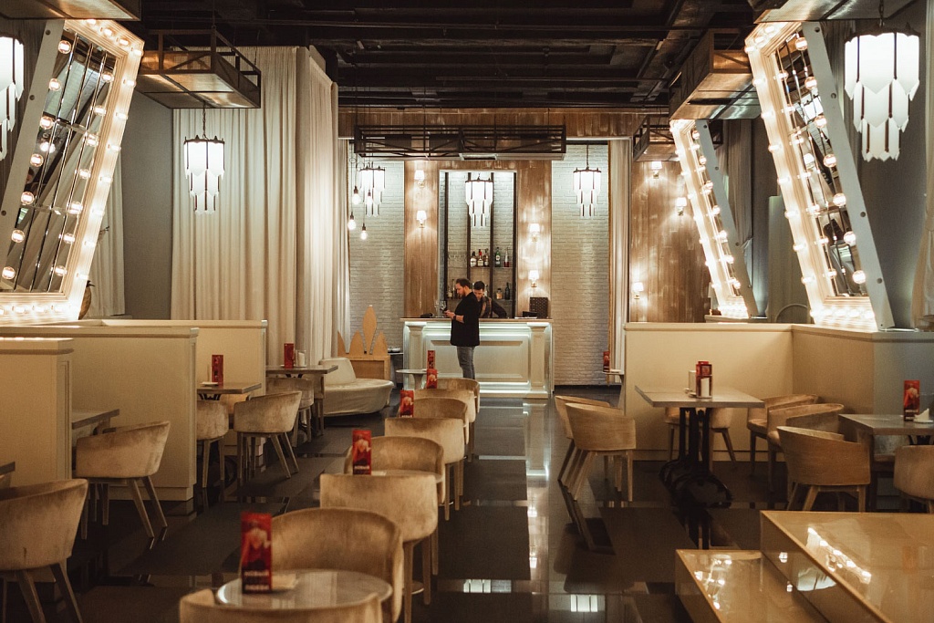 Интерьеры Белого и Черного баров, находящихся по левую и правую руку – не менее экспериментальный проект известного модельера Валентина Юдашкина. Черный бар – пространство для малых концертных форм, светских коктейлей и праздничных фуршетов. В Белом баре, напоминающим гримерки артистов, после вечерних шоу начинается музыкальная программа с участием артистов «Ленинград Центра». Show must go on…