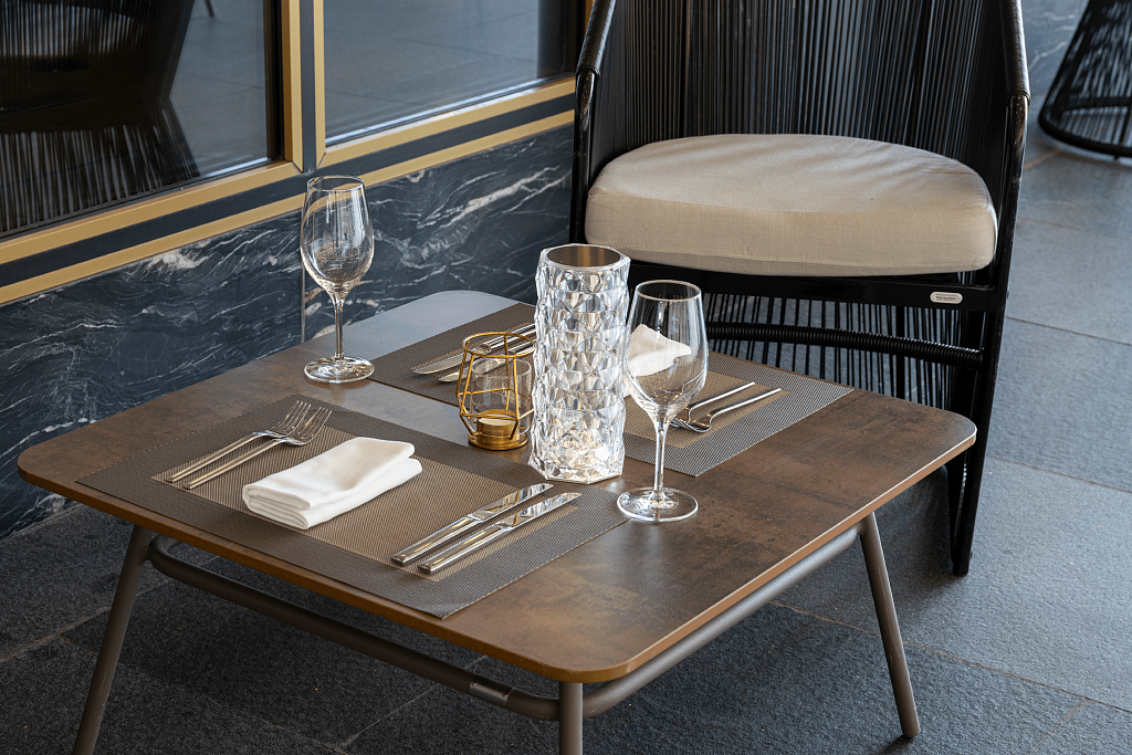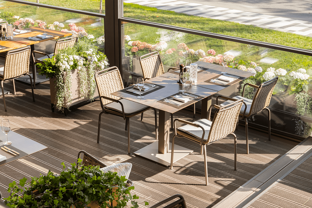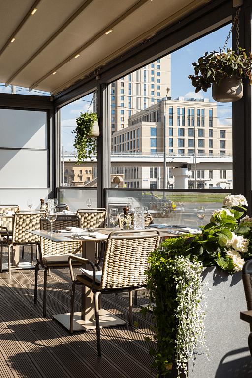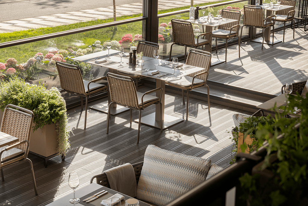 Особенностью террасы является креативное озеленение всего пространства. Заходя на террасу, гости погружаются в красоту природы и стильный дизайн, которые акцентируют отель и обновлённый ресторан, объединяя еду, музыку, искусство и моду.