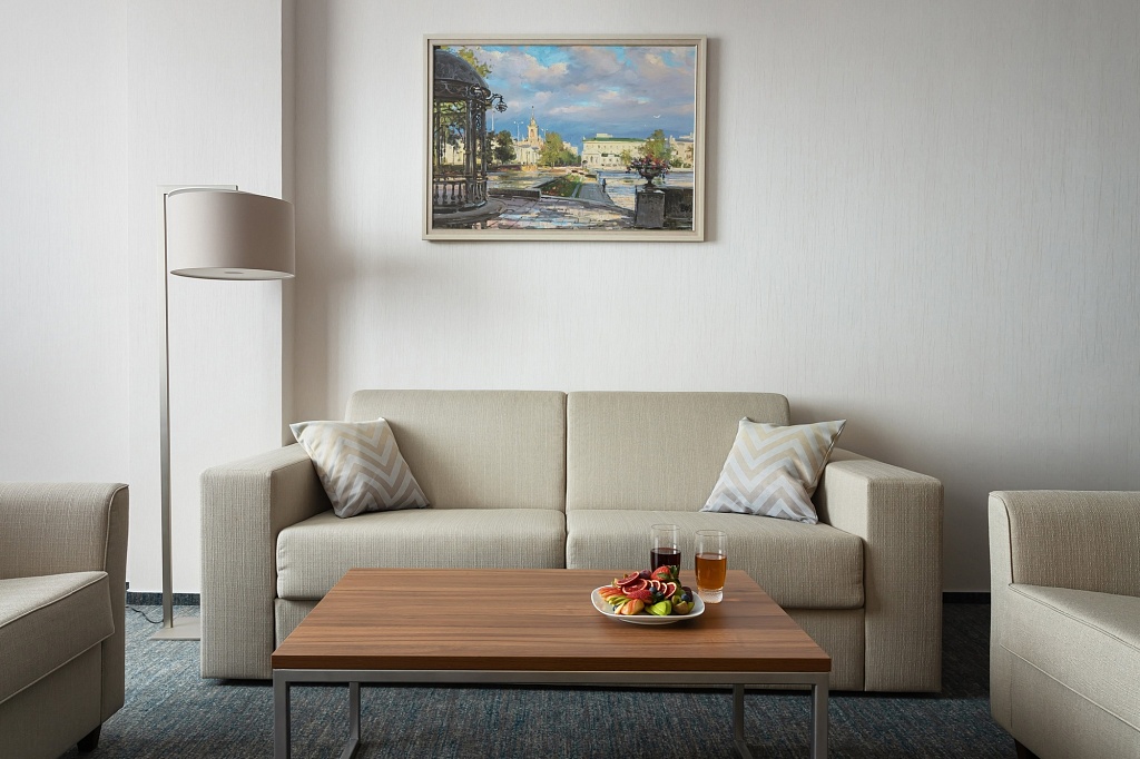 Люкс Супериор (49 м2). Видовой двухкомнатный номер со спальней, гостиной, гардеробной и ванной комнатой. В гостиной – рабочее пространство, софа, которая раскладывается в полноценное спальное место, и массажное кресло Yamaguchi. Предусмотрен вечерний сервис и бесплатный поздний выезд до 16.00.