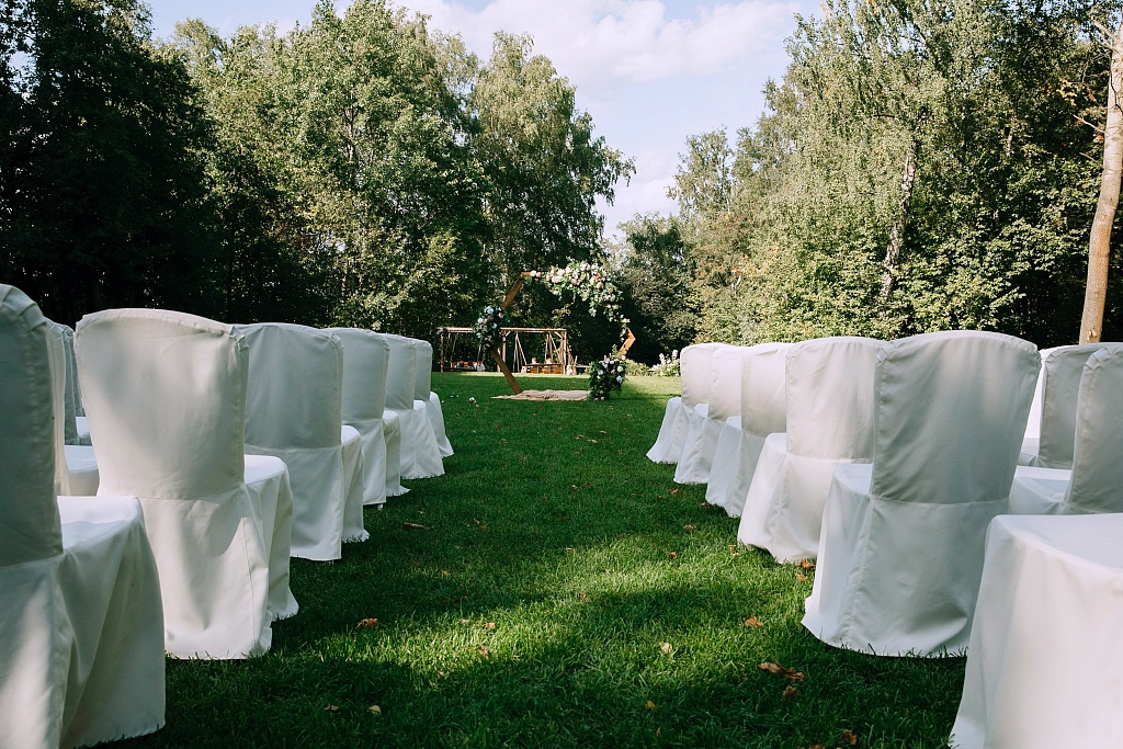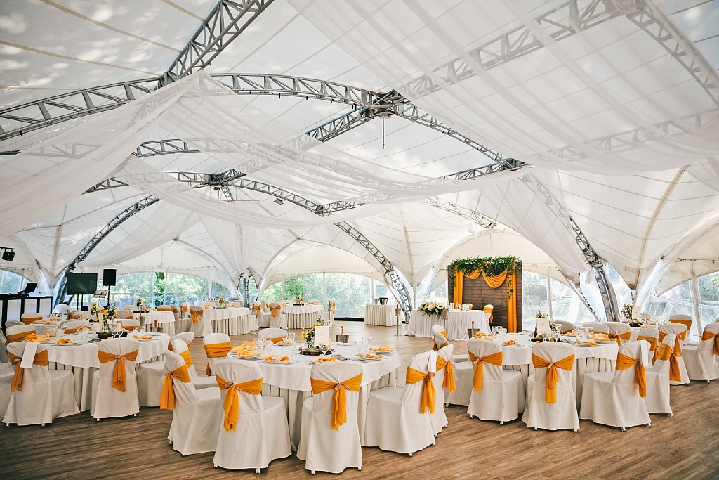 Если вы хотите провести свадьбу на свежем воздухе, мы предлагаем арендовать просторный шатер площадью 500 кв. метров и парковую территорию с летней беседкой.