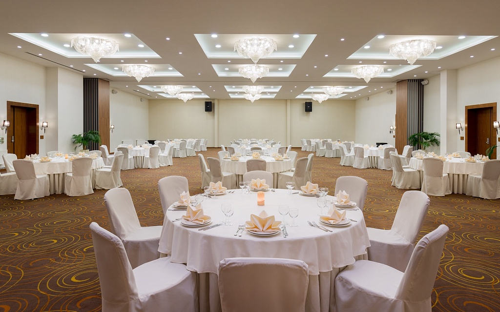 Отель предлагает конференц-залы с панорамными окнами и видом на Химкинский лес или залы с высокими четырехметровыми потолками украшенными хрустальными люстрами.