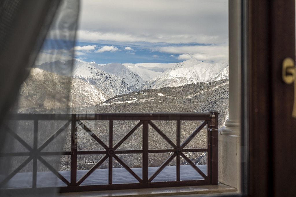 Семиэтажное здание Novotel видно издалека — оно возвышается на солнечном склоне горы, как замок с красивой открытки. Отель расположен на отметке +960 метров и из его окон открываются завораживающие виды — тоже можно сказать, что абсолютно открыточные: и вниз на долину, и вверх на величественные горы.