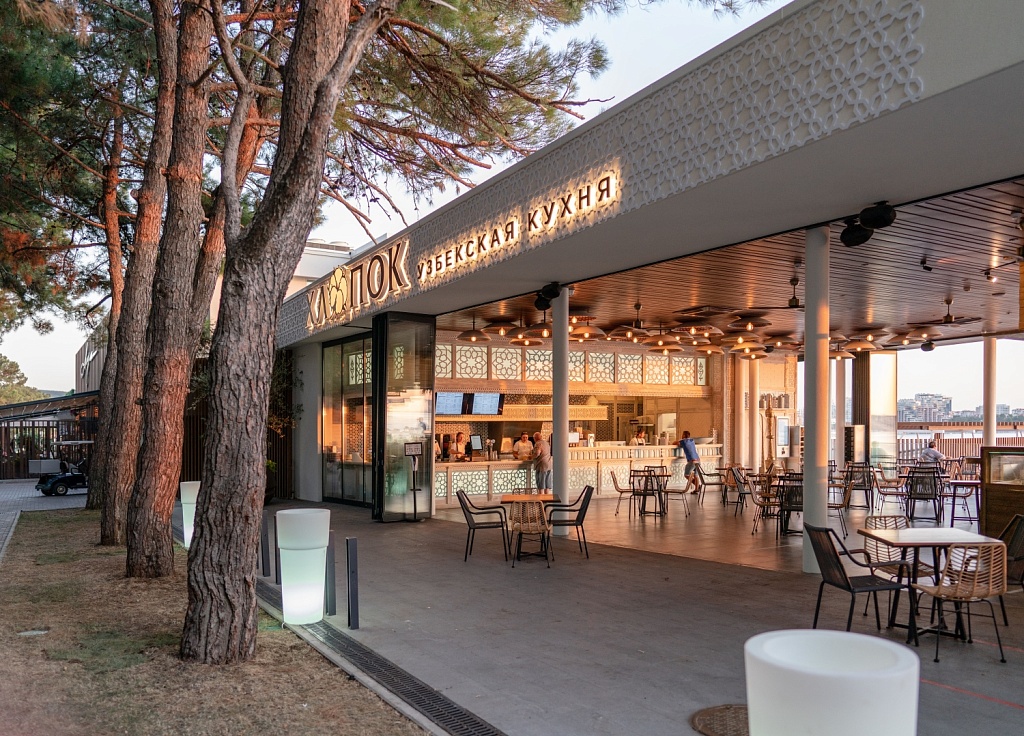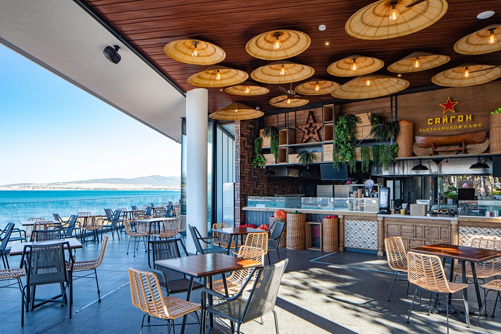 Часть ресторанов курорта, расположены у моря и представляют собой красивую Гастрономическую набережную «ПРИМОРЬЕ». Первый фуд-корт в Геленджике представляет кухни сразу пяти стран мира и состоит из нескольких заведений: ресторана узбекской кухни «Хлопок», Sunset Bar, кафе паназиатской кухни «Сайгон», легендарного ресторана грузинской кухни “Трофей” и нового итальянского ресторана «Сыроварня» от Novikov Group.