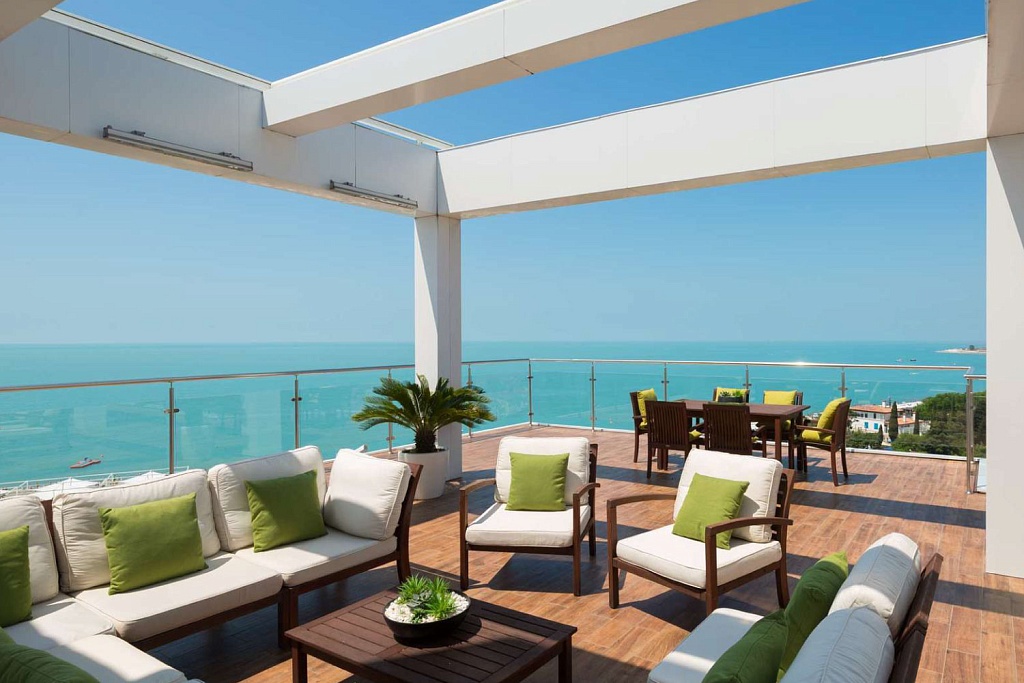 Еще одной исключительной площадкой в отеле Radisson Collection Paradise Resort & SPA, Sochi для проведения гастроужина является терраса Президентского люкса, вмещающая до 30 гостей. С этой террасы открывается захватывающий вид на Черное море и Олимпийский парк. Уникальный вид можно дополнить легким DJ-сетом, а эксклюзивные блюда утонченным вином от профессионального сомелье. Не забудьте и про исключительную фотосессию, которая подарит вам лучшие в вашей жизни кадры.